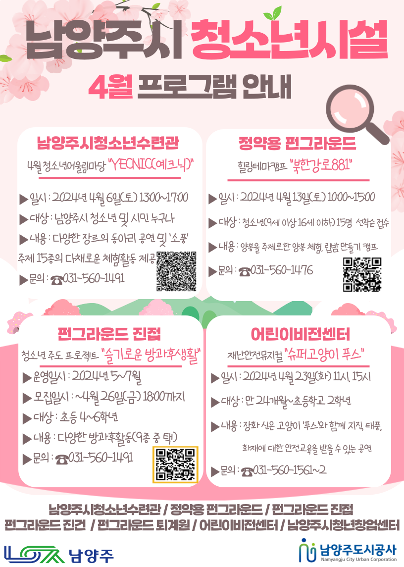 남양주시청소년수련관·정약용 펀그라운드·펀그라운드 진접·펀그라운드 진건·펀그라운드 퇴계원·남양주시 청년창업센터가 연합하여 "남양주시 청소년시설 4월 프로그램"을 안내합니다!!