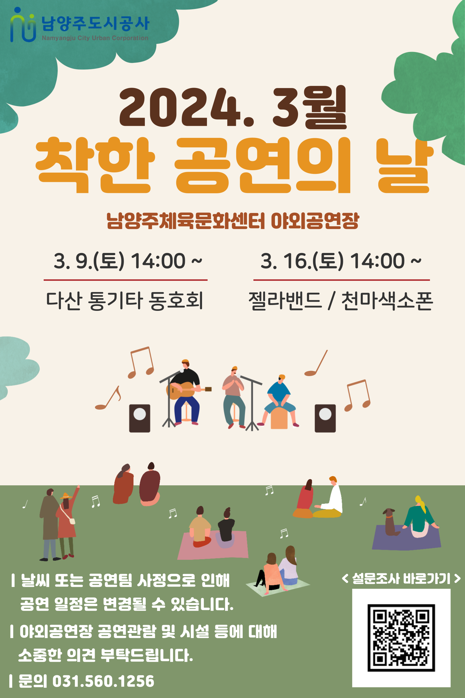 진접 [안내] 남양주체육문화센터 3월 "착한공연의 날" 문화공연 안내 작성자 펀그라운드진접 등록일자 2024년 3월 6일 13시 51분 5초 조회 228 착한공연의날 홍보지.png [ Size : 581.3KB, Down : 133 ] 미리보기 다운로드 목록보기