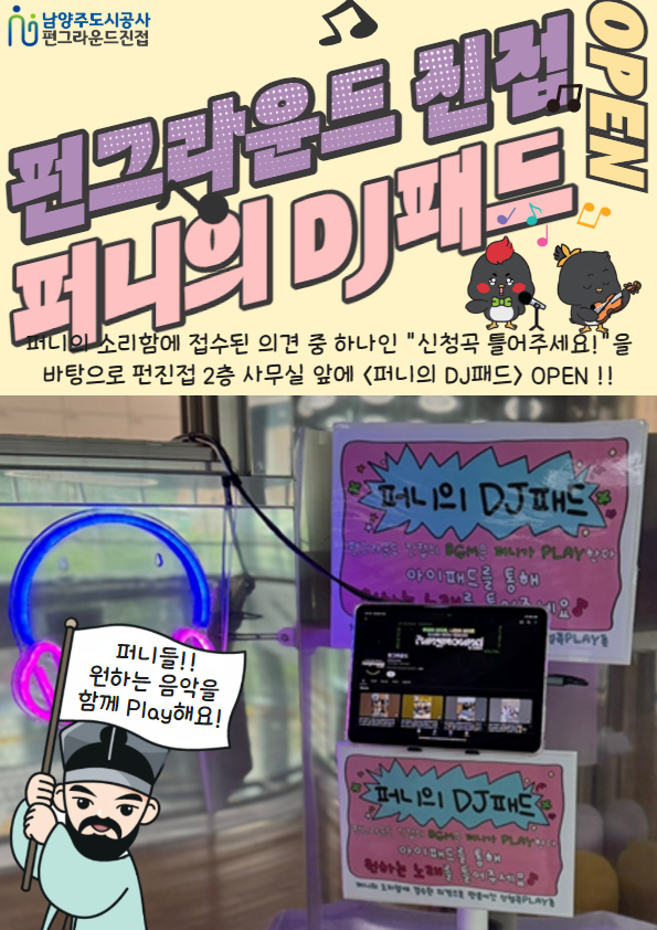 공지 진접 [공지] 펀그라운드 진접 퍼니의 DJ패드 OPEN 작성자 펀그라운드진접 등록일자 2025년 5월 28일 20시 50분 30초 조회 153 드디어!! 펀그라운드 진접에 <퍼니의 DJ패드> OPEN했어요!!..여러분의 신청곡을 틀어주는 특별한 공간! "신청곡 틀어주세요!"라는 여러분의 소중한 의견을 바탕으로 만들어졌답니다^^.이제 펀진접 2층 사무실 앞에서 원하는 음악을 자유롭게 즐길 수 있어요!..여러분의 신청곡을 틀어줄 수 있는 공간!어제도, 오늘도, 내일도! 언제든지 원하는 음악을 들려주세요!펀그라운드 진접 2층 사무실 앞에서 함께 즐겨요!..언제든지 퍼니의 DJ가 되어보세요!문의)031-560-1386 퍼니의 DJ패드 (1).jpg [ Size : 507.67KB, Down : 65 ] 미리보기 다운로드 목록보기