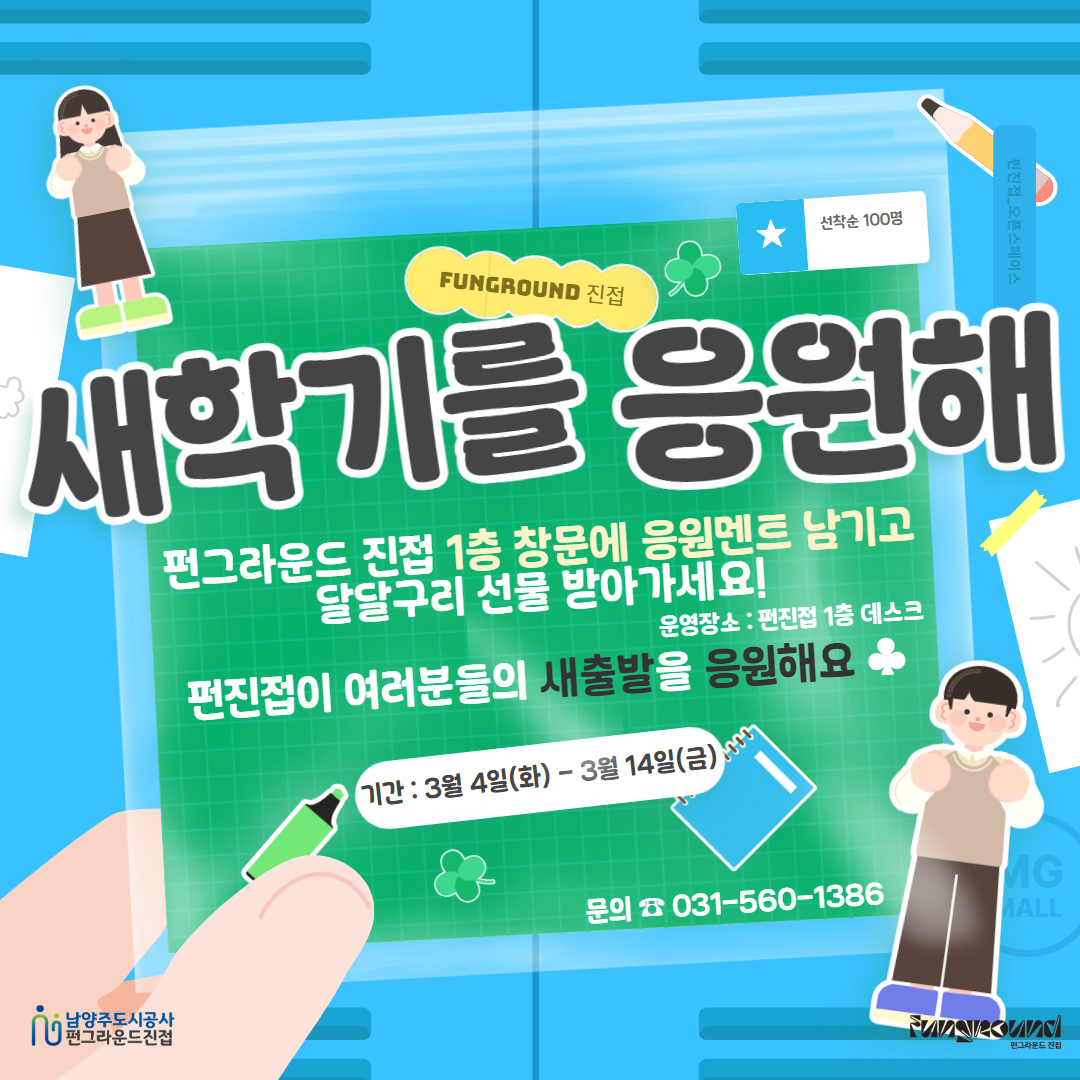진접 [이벤트] 새학기를 응원해! ※마감 작성자 펀그라운드진접 등록일자 2025년 2월 28일 10시 22분 55초 조회 198 펀진접이 여러분들의 새출발을 응원합니다!...청소년이라면 누구나선착순 100명응원멘트 남기면 달달구리 간식 제공합니다!..펀진접에서 만나요!!문의 ☎ 031-560-1386※ 선착순 100명 참여로 인한 모집 마감 제목을 입력하세요 (23).jpg [ Size : 826.33KB, Down : 92 ] 미리보기 다운로드 목록보기