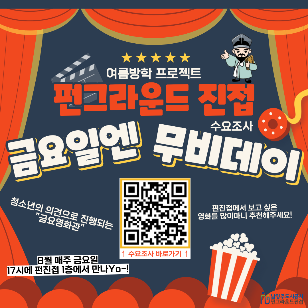 진접 [공지] 여름방학 프로젝트 "금요일엔 무비데이" 상시 니즈조사!! 작성자 펀그라운드진접 등록일자 2025년 8월 7일 14시 4분 21초 조회 108 펀그라운드 진접여름방학 프로젝트 “금요일엔 무비데이”!.."금요일엔 무비데이"가 진접의 펀그라운드에서 매주 금요일 오후 5시부터 7시까지 진행돼요!.영화 고르는 건 우리 퍼니들!여러분의 의견 기다리고 있어요!.영화 보고, 친구 만나고, 여름의 추억 만들러 오세요! 무비데이 수요조사.png [ Size : 322.41KB, Down : 49 ] 미리보기 다운로드 목록보기