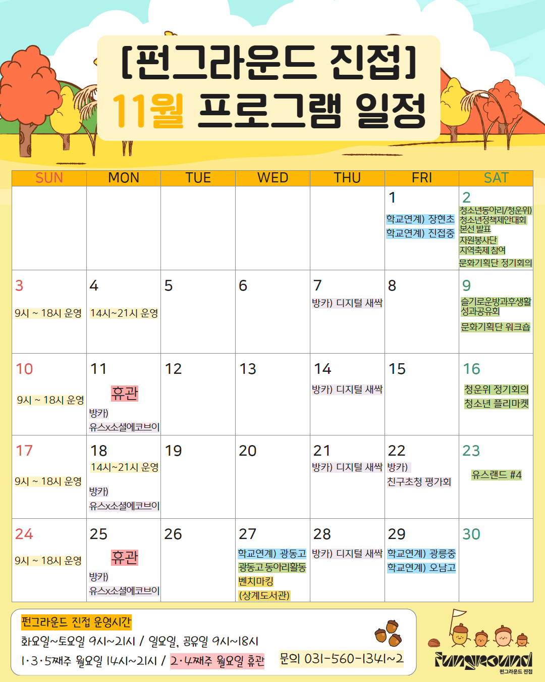 진접 [공지] 펀그라운드 진접 11월 일정 작성자 펀그라운드진접 등록일자 2024년 11월 1일 15시 10분 56초 조회 260 진접 11월 일정표 (2).jpg [ Size : 719.38KB, Down : 106 ] 미리보기 다운로드 목록보기