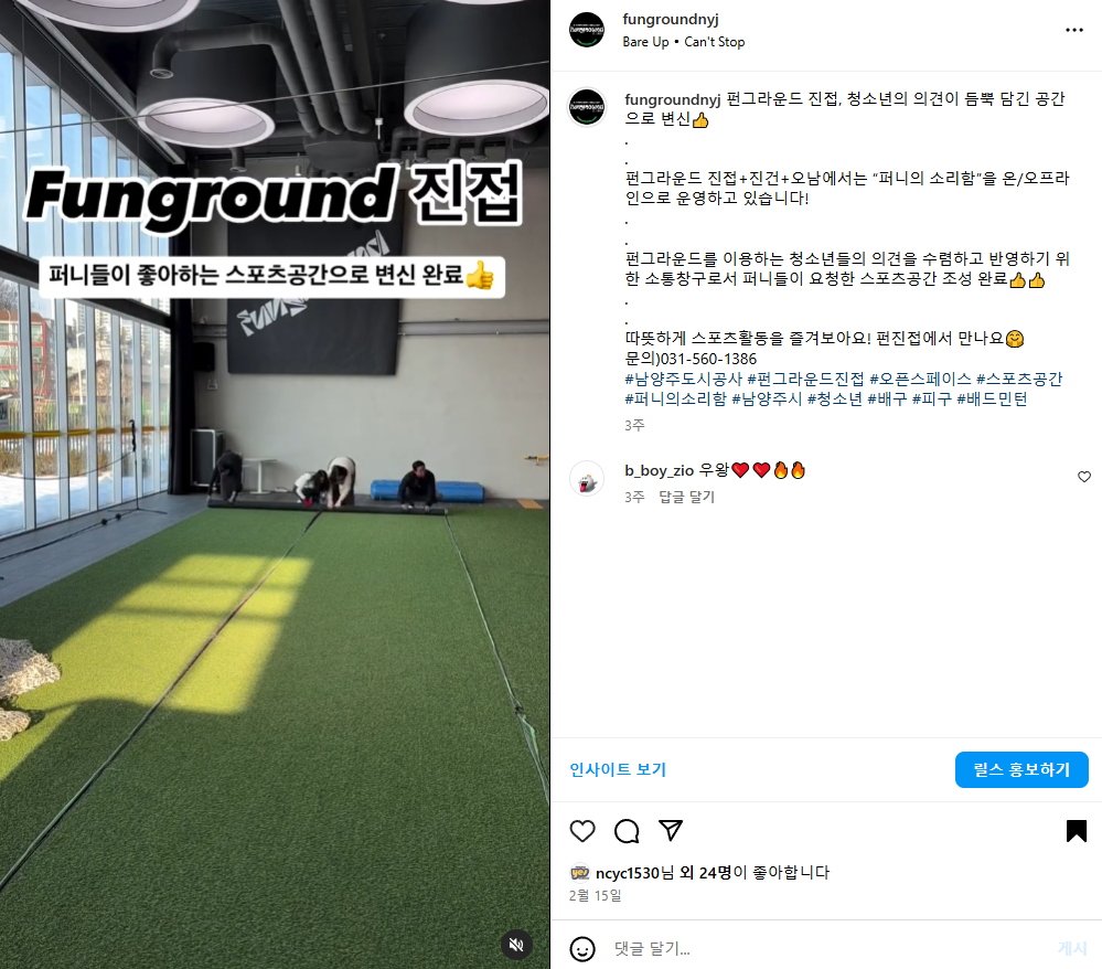 펀그라운드를 이용하는 청소년들의 의견을 수렴하고 반영하기 위한 소통창구로서 퍼니들이 요청한 스포츠공간 조성 완료!!!