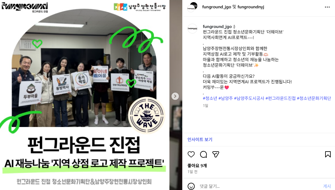 진접 [진접] 청소년문화기획단 지역연계 AI프로젝트 '장현시장 상점 로고 제작' 작성자 펀그라운드진접 등록일자 2025년 11월 26일 17시 8분 7초 조회 41 KakaoTalk_20251126_170520007.png [ Size : 581.03KB, Down : 13 ] 미리보기 다운로드 목록보기
