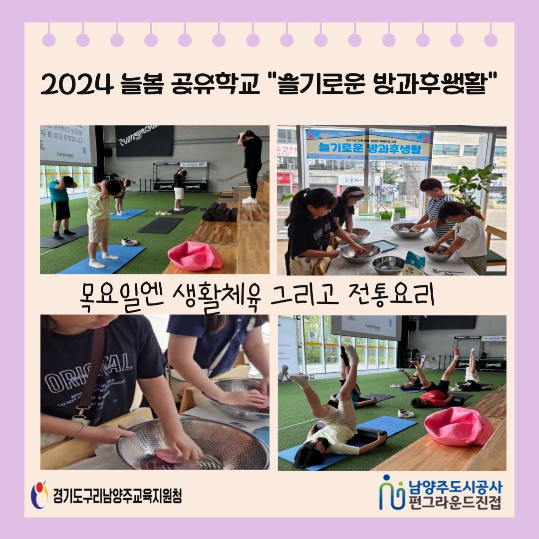 진접 [펀그라운드 진접] 슬기로운 방과후생활(6/27) 작성자 펀그라운드진접 등록일자 2024년 6월 29일 14시 37분 18초 조회 259 구리남양주교육지원청에서 지원하는 2024 늘봄 공유학교가 펀그라운드 진접에서 운영중입니다목요일은 생활체육과 전통요리!내일도, 모레도, 7월까지 슬기로운 방과후생활 1학기가 운영되니 활동에 대해 많은 관심부탁드립니다!문의) 031-560-1386 제목을-입력해주세요_-005.png [ Size : 1.02MB, Down : 82 ] 미리보기 다운로드 목록보기