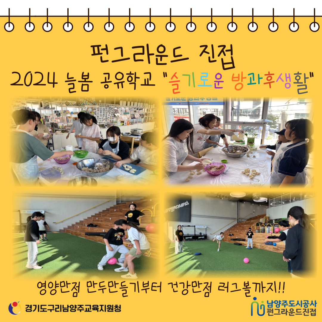 진접 [펀그라운드 진접] 슬기로운 방과후생활 (5/16) 작성자 펀그라운드진접 등록일자 2024년 5월 16일 18시 28분 37초 조회 225 구리남양주교육지원청에서 지원하는 "2024 늘봄 공유학교"가 펀그라운드 진접에서 운영중입니다목요일은 마스터쉐프K(전통요리)와 생활체육 시간!!!마스터쉐프K에서는 제면기를 활용해 만두피부터 만두속까지 "만두만들기"를 하고, 생활체육에서는 러그볼을 활용해서 건강쑥쑥 타임을 가졌습니다!!내일도, 모레도, 7월까지 슬기로운 방과후생활 1학기가 운영되니 활동에 대해 많은 관심부탁드립니다!!문의) 031-560-1386 제목을-입력해주세요_-001 (20).png [ Size : 1.13MB, Down : 81 ] 미리보기 다운로드 목록보기