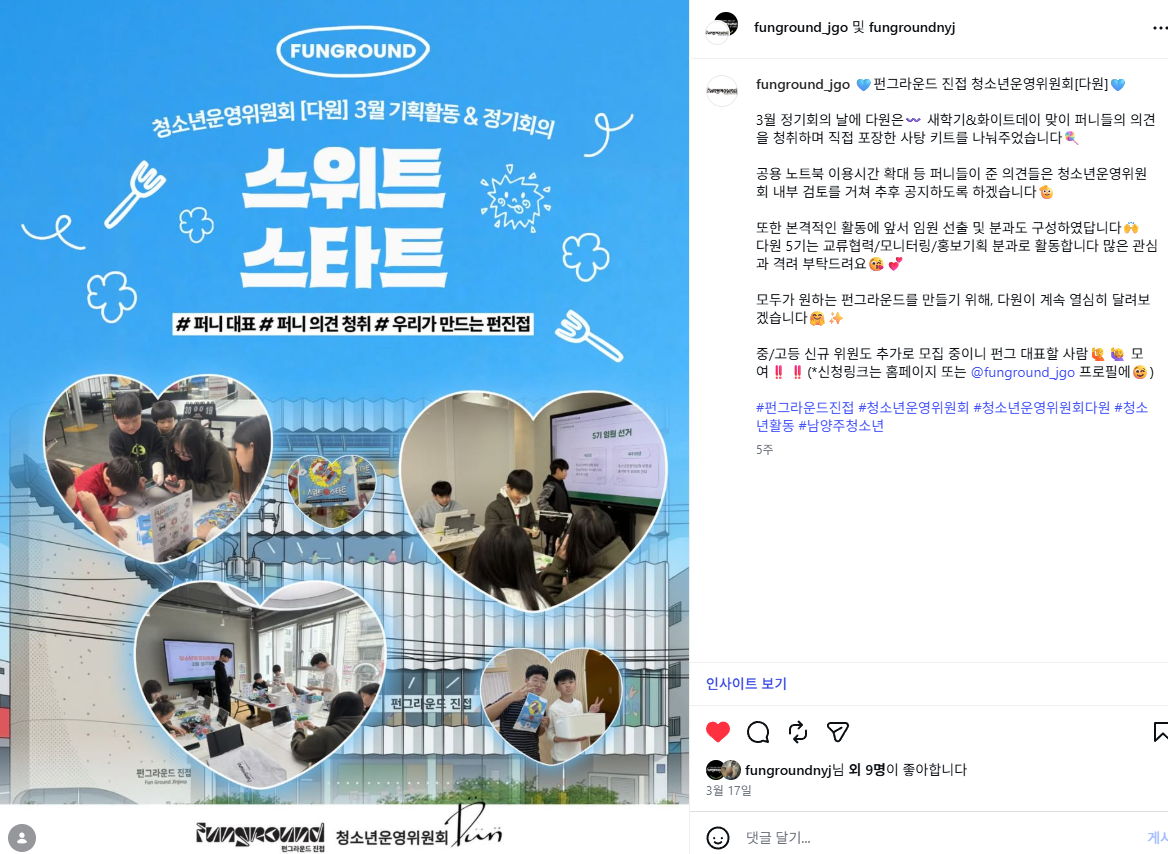 진접 청소년운영위원회 다원 3월 정기회의 작성자 펀그라운드진접 등록일자 2026년 4월 23일 18시 56분 28초 조회 2 KakaoTalk_20260423_184606892.png [ Size : 1.11MB, Down : 2 ] 미리보기 다운로드 목록보기