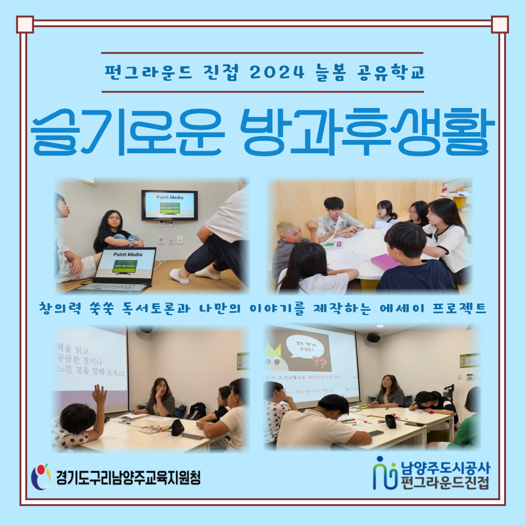진접 [펀그라운드 진접] 슬기로운 방과후생활(5/31) 작성자 펀그라운드진접 등록일자 2024년 5월 31일 20시 53분 18초 조회 215 구리남양주교육지원청에서 지원하는 ”2024 늘봄 공유학교“가 펀그라운드 진접에서 운영중입니다 금요일은 독서토론 그리고 에세이 제작Time!!오늘도 창의력 쑥쑥 표현력 쑥쑥!! 토론활동과 단 하나뿐인 에세이를 만들었습니다!!내일도, 모레도, 7월까지 슬기로운 방과후생활 1학기가 운영되니 활동에 대해 많은 관심부탁드립니다!!문의) 031-560-1386 제목을-입력해주세요_-001 (1) (10).png [ Size : 665.41KB, Down : 85 ] 미리보기 다운로드 목록보기