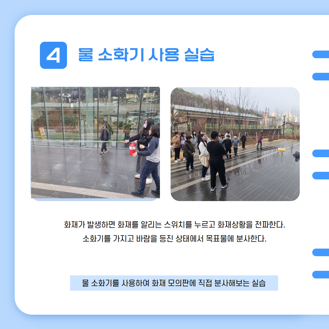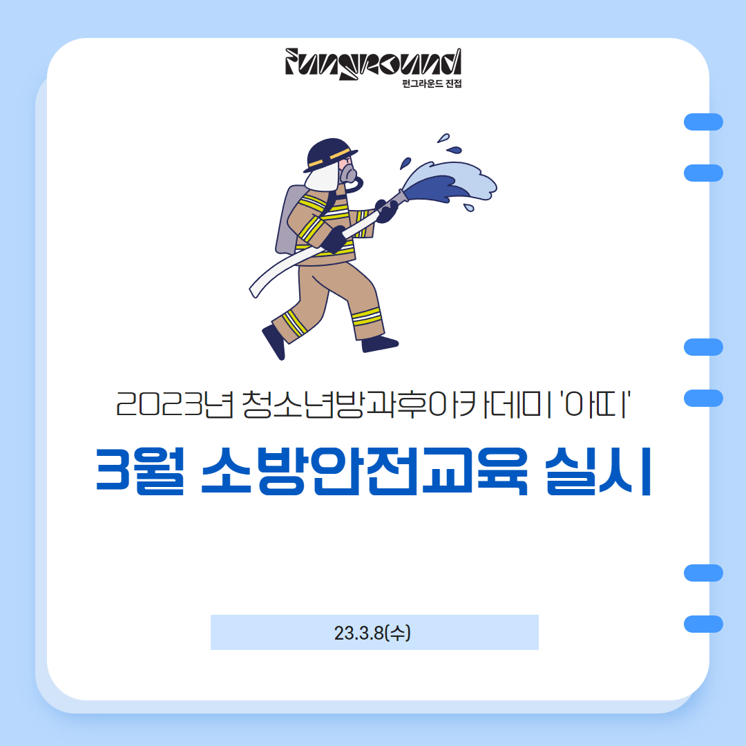 펀그라운드 진접 청소년방과후아카데미에서는 23.3.8(수) 재학생들에게 시설 내 화재사고를 예방하고 소화기 사용법 및 대피요령 교육을 통한 위기 상황 대처 능력을 향상을 위해 소방안전교육을 실시하였습니다.