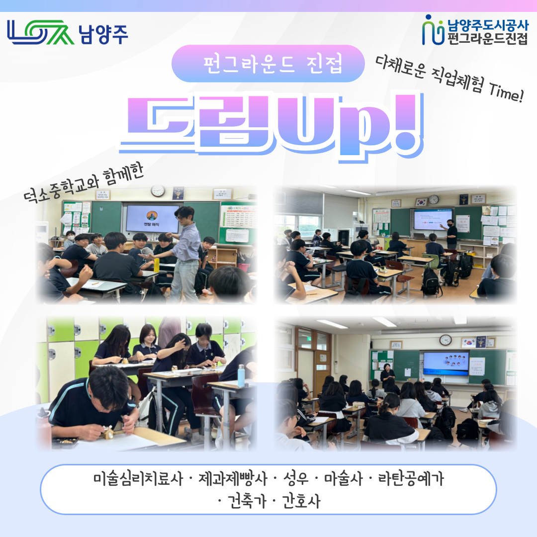 진접 [펀그라운드 진접] 학교연계 "드림Up" (덕소중) 작성자 펀그라운드진접 등록일자 2024년 5월 30일 16시 7분 31초 조회 249 5월 30일 목요일, 덕소중학교에서 직업체험 활동을 진행했습니다!!미술심리치료사, 제과제빵사 등 다채로운 직업군 일곱 분의 전문강사진과 함께했는데요~!!다음엔 어떤 직업체험이 있을까요~?드림Up의 다양한 직업체험 기대 많이X100 해주세요!!문의) 031-560-1346 제목을-입력해주세요_-001 (28).png [ Size : 879.18KB, Down : 109 ] 미리보기 다운로드 목록보기