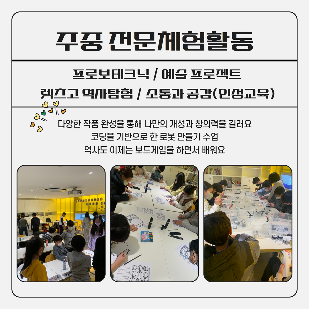 기본교과학습지원 / 주중전문체험활동 / 학습지원 및 체험역량강화활동 / 특별활동 / 생활안전교육 등 다양한 프로그램으로 진행됩니다.
