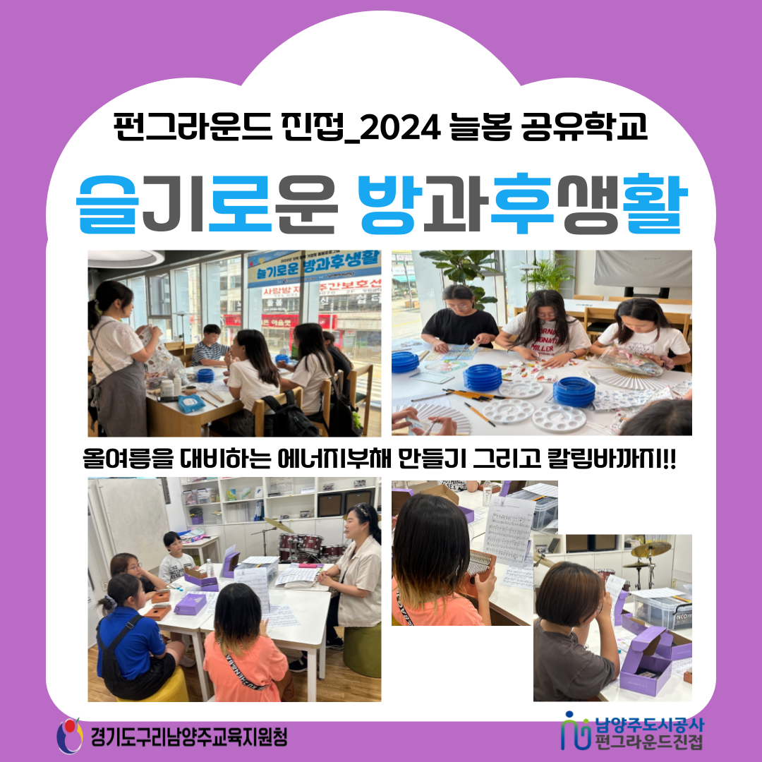 진접 [펀그라운드 진접] 슬기로운 방과후생활(6/12) 작성자 펀그라운드진접 등록일자 2024년 6월 12일 16시 10분 58초 조회 234 구리남양주교육지원청에서 지원하는 ”2024 늘봄 공유학교“가 펀그라운드 진접에서 운영중입니다수요일은 생활공예와 음악시간!!올여름을 대비하여 에너지부채를 만들고 칼림바와 오카리나를 연주했습니다!!내일도, 모레도, 7월까지 슬기로운 방과후생활 1학기가 운영되니 활동에 대해 많은 관심부탁드립니다!!문의) 031-560-1386 제목을-입력해주세요_-002 (1) (1).png [ Size : 893.11KB, Down : 69 ] 미리보기 다운로드 목록보기