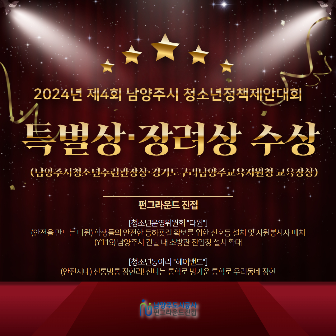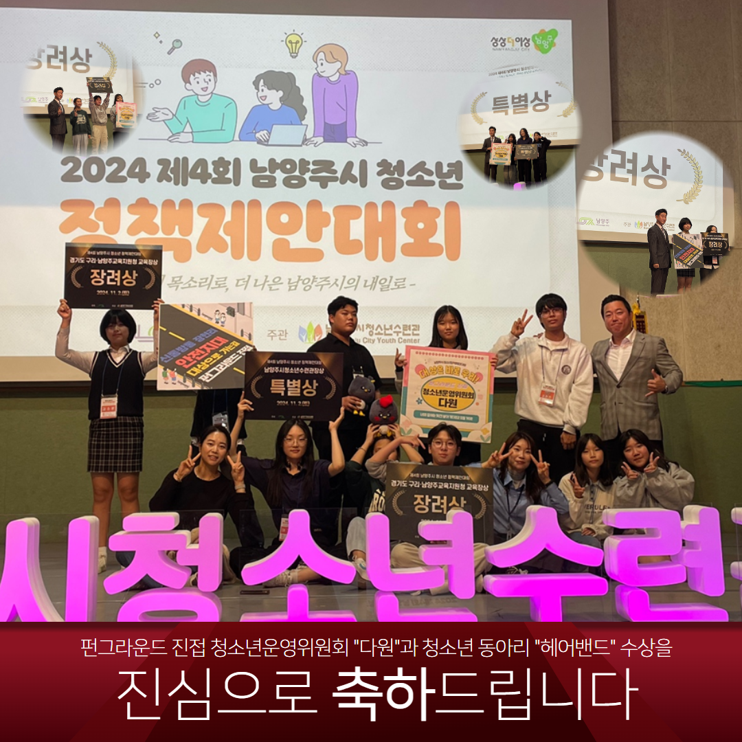 진접 제4회 남양주시 청소년정책제안대회 수상(청운위, 동아리) 작성자 펀그라운드진접 등록일자 2024년 11월 5일 16시 1분 57초 조회 184 제목을 입력하세요 (14).png [ Size : 2.02MB, Down : 66 ] 미리보기 다운로드 제목을 입력하세요 (18).jpg [ Size : 890.88KB, Down : 71 ] 미리보기 다운로드 목록보기
