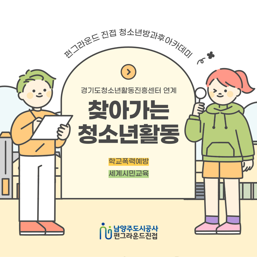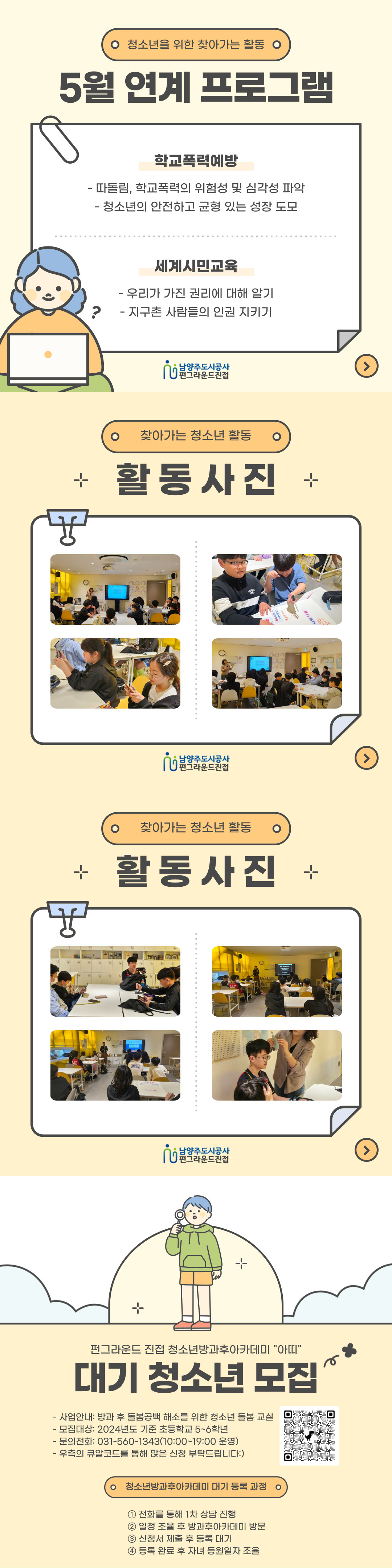 진접 [펀그라운드 진접] 청소년방과후아카데미 "아띠" 학교폭력예방, 세계시민교육 특강 작성자 펀그라운드진접 등록일자 2024년 5월 13일 14시 1분 50초 조회 232 펀그라운드 진접 청소년방과후아카데미 "아띠"경기도청소년활동진흥센터와 연계하여 학교폭력예방, 세계시민교육 특강을 진행하였습니다:)#펀그라운드진접 #청소년방과후아카데미 #초등돌봄 #아띠 #남양주시 #남양주도시공사 #많관부 001.jpg [ Size : 183.17KB, Down : 95 ] 미리보기 다운로드 찾아가는청소년활동.jpg [ Size : 758.64KB, Down : 84 ] 미리보기 다운로드 목록보기
