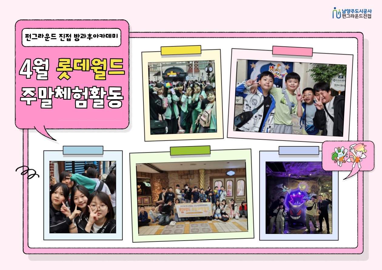 진접 [펀그라운드 진접] 청소년방과후아카데미 "아띠" 4월 주말체험활동 롯데월드 작성자 펀그라운드진접 등록일자 2025년 4월 21일 14시 36분 52초 조회 222 4월 19일 토요일 첫번째 주말체험활동으로 롯데월드에 다녀왔습니다!아띠가 즐기고 온 롯데월드! 함께 만나보시죠 :D 홍보물(롯데월드).png [ Size : 866.89KB, Down : 78 ] 미리보기 다운로드 목록보기