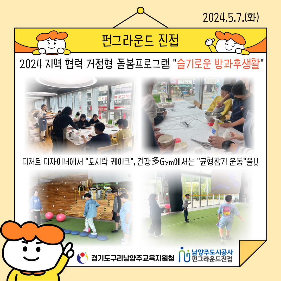 진접 [펀그라운드 진접] 슬기로운 방과후생활(5/7) 작성자 펀그라운드진접 등록일자 2024년 5월 7일 18시 0분 42초 조회 218 구리남양주교육지원청에서 지원하는 2024년 지역 협력 거점형 돌봄프로그램 "슬기로운 방과후생활"이 시작됐습니다!! 오늘은 첫번째날로 디저트 디자이너에서 도시락 케이크를 만들고, 건강多Gym에서는 균형잡기 마스터까지!!!내일도, 모레도, 7월까지 슬기로운 방과후생활 1학기가 운영되니 활동에 대해 많은 관심부탁드립니다!! 문의) 031-560-1386 제목을-입력해주세요_-001 (15).png [ Size : 937.93KB, Down : 81 ] 미리보기 다운로드 목록보기