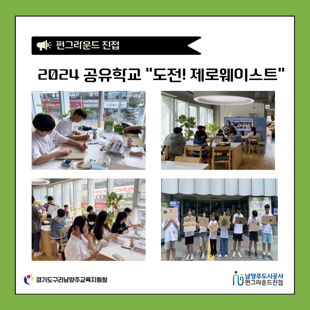 진접 [펀그라운드 진접] 2024 공유학교 (지속공유학교-도전! 제로웨이스트) 작성자 펀그라운드진접 등록일자 2024년 6월 1일 16시 45분 21초 조회 223 6월 1일 토요일, "2024 공유학교"가 운영중에 있습니다!!"도전! 제로웨이스트"는 환경 문제에 대해 이야기하고, 실습과 과제를 통한 환경에 대한 정보를 습득하고 있습니다!펀그라운드 진접은 청소년들이 안전하고 즐겁게 활동할 수 있도록 노력하겠습니다!감사합니다 !!문의) 지속공유학교 031-560-1386 제목을-입력해주세요_-002 (3).png [ Size : 825.77KB, Down : 76 ] 미리보기 다운로드 목록보기