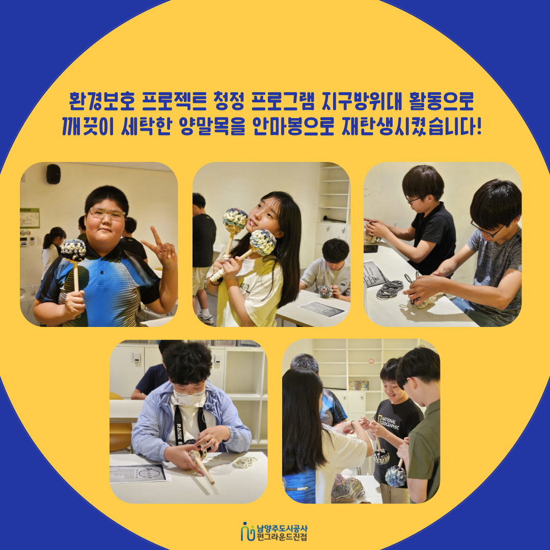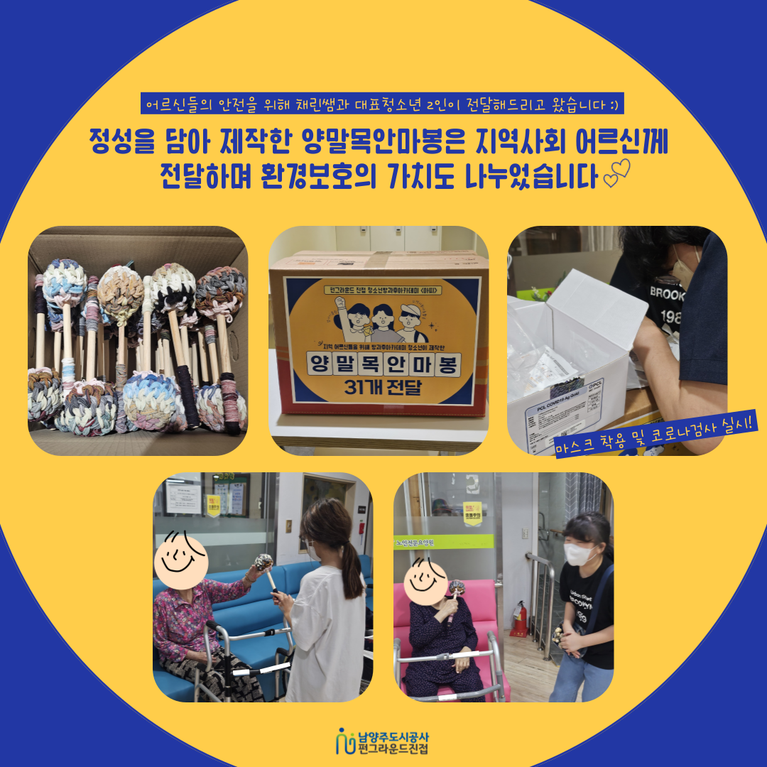 환경보호 프로젝트 청정 활동으로 정성을 담아 제작한 업사이클링 양말목안마봉을 가지고 요양원에 방문하여