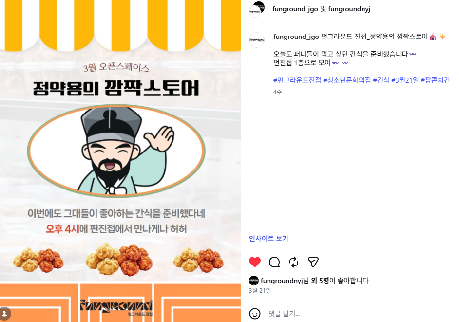 진접 오픈스페이스 3월 정약용의 깜짝스토어 작성자 펀그라운드진접 등록일자 2026년 4월 23일 18시 58분 17초 조회 2 KakaoTalk_20260423_184650992.png [ Size : 394.1KB, Down : 2 ] 미리보기 다운로드 목록보기