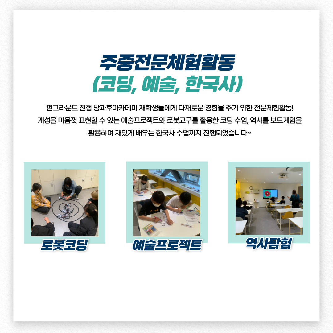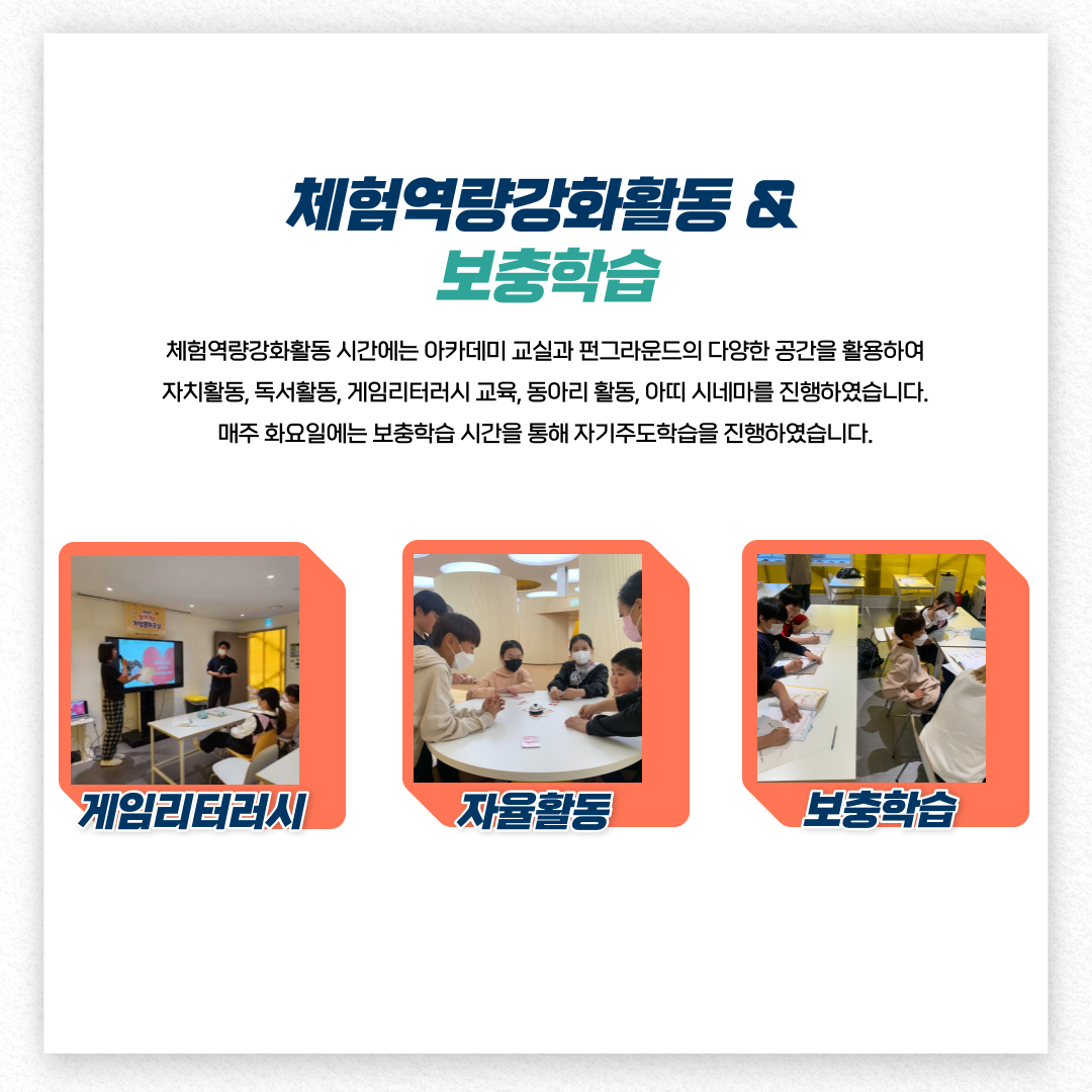 기본교과학습지원 / 주중전문체험활동 / 게임리터러시교육 / 학습지원 및 체험역량강화활동 / 특별활동 / 생활안전교육 등 다양한 프로그램으로 진행됩니다.