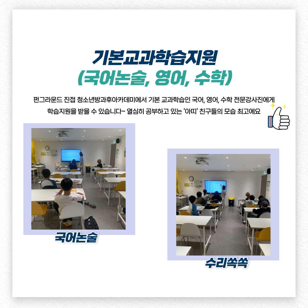 청소년방과후아카데미는 하교후 방과후 시간에 펀그라운드 진접에 와서 교과학습과 다양한 체험활동, 생활관리를 종합적으로 받을 수 있는데요!