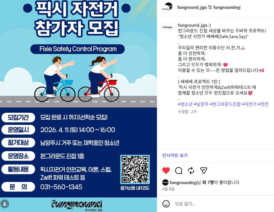 진접 세상을 바꾸는 두바퀴 프로젝트 픽스 자전거 안전 교육 작성자 펀그라운드진접 등록일자 2026년 4월 23일 19시 6분 25초 조회 2 KakaoTalk_20260423_185141389.png [ Size : 497.16KB, Down : 1 ] 미리보기 다운로드 목록보기