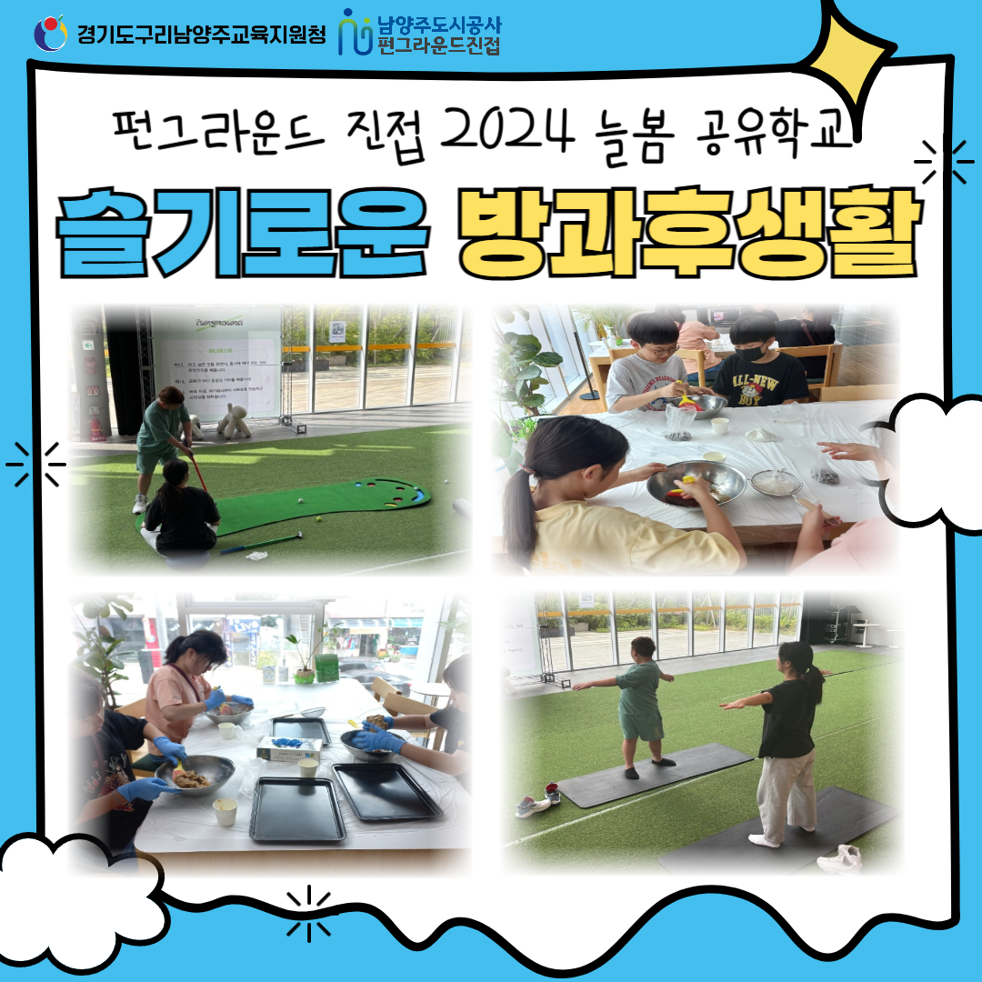 진접 [펀그라운드 진접] 슬기로운 방과후생활(6/25) 작성자 펀그라운드진접 등록일자 2024년 6월 26일 10시 21분 57초 조회 230 [펀그라운드 진접] 슬기로운 방과후생활구리남양주교육지원청에서 지원하는 ”2024 늘봄 공유학교“가 펀그라운드 진접에서 운영중입니다화요일은 디저트 제작과 생활체육내일도, 모레도, 7월까지 슬기로운 방과후생활 1학기가 운영되니 활동에 대해 많은 관심부탁드립니다!!문의) 031-560-1386 제목을 입력해주세요_-001.png [ Size : 1.16MB, Down : 94 ] 미리보기 다운로드 목록보기