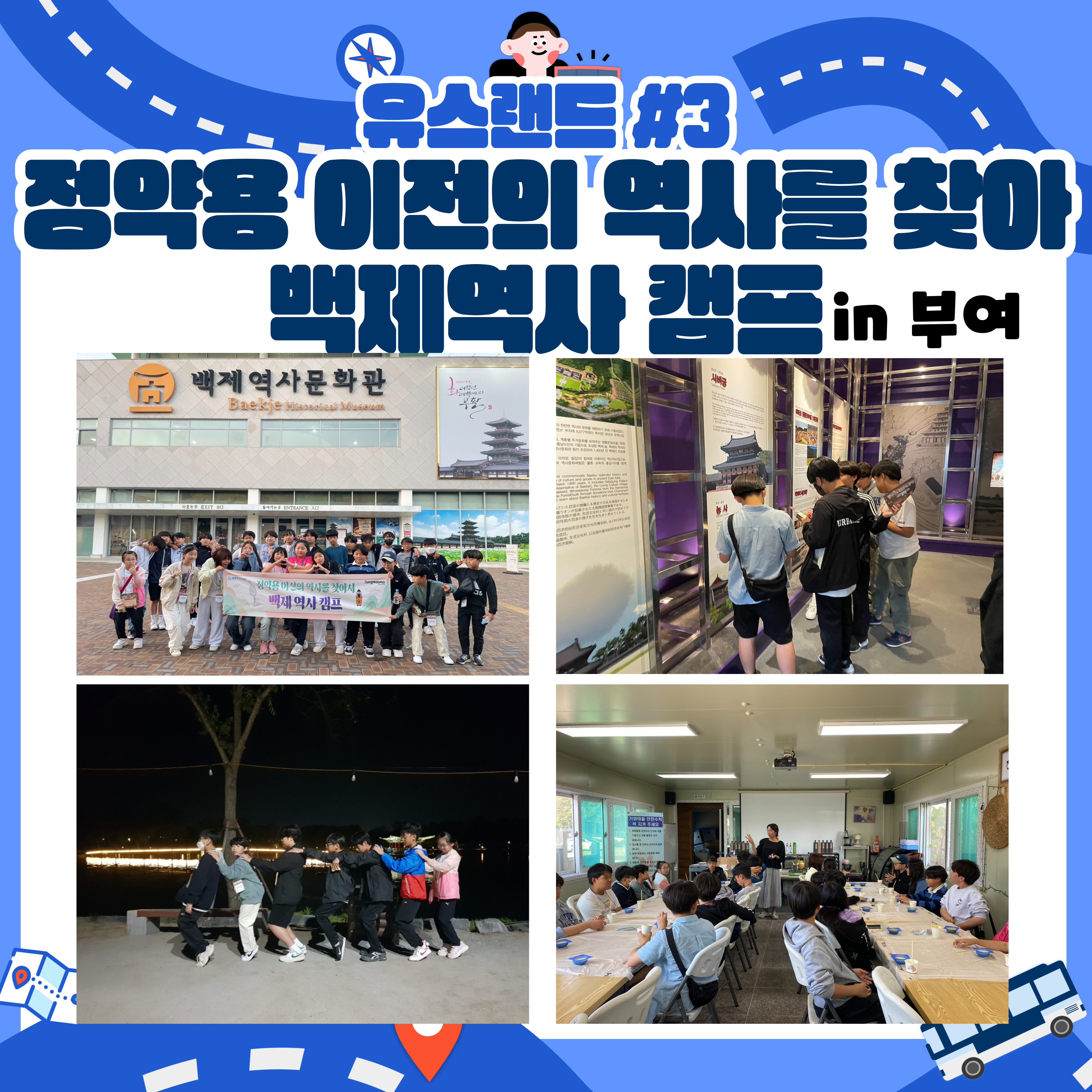 진접 유스랜드 #3 '정약용 이전의 역사를 찾아 백제역사 캠프' 작성자 펀그라운드진건 등록일자 2024년 10월 24일 18시 39분 6초 조회 318 10월 12일(토)~13(일) 동안 부여에서 1박 2일 캠프를 진행했습니다석화암 향초, 연꽃 비누도 만들고 백제문화단지부터 궁남지까지 탐방한 알찬 시간이었습니다마지막 남은 캠프도 많은 관심부탁드립니다~~!!문의 : 031-560-1346 유스랜드#3.jpg [ Size : 2MB, Down : 98 ] 미리보기 다운로드 목록보기