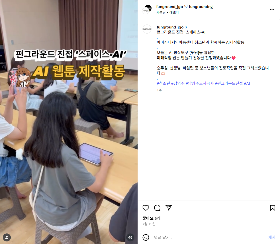 진접 [진접] 스페이스 -AI 웹툰만들기 활동 작성자 펀그라운드오남 등록일자 2025년 8월 1일 15시 52분 5초 조회 125 활동 영상https://www.instagram.com/reel/DMRd6VdR3y7/ 스크린샷 2025-08-01 155214.png [ Size : 608.78KB, Down : 45 ] 미리보기 다운로드 목록보기