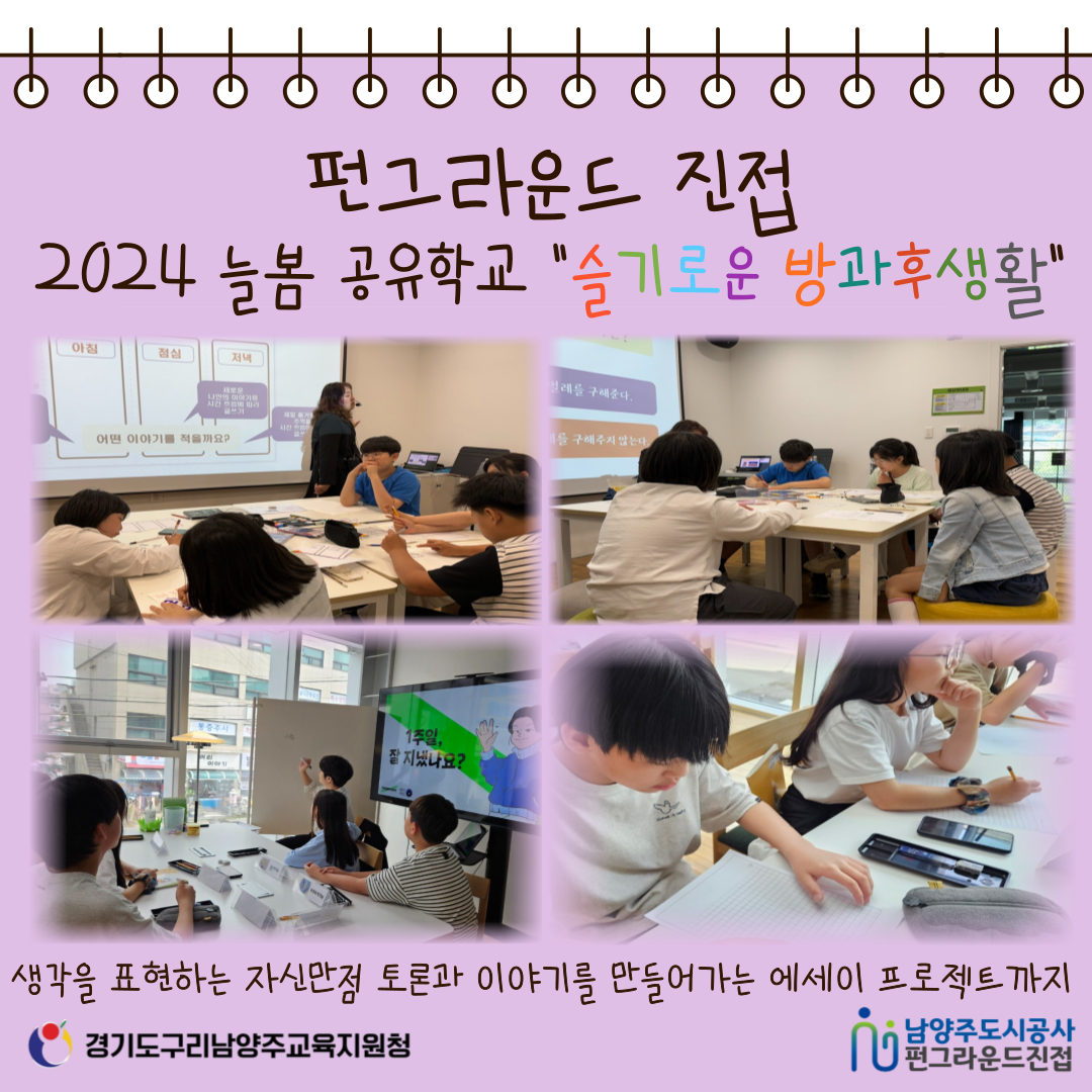 진접 [펀그라운드 진접] 슬기로운 방과후생활(5/17) 작성자 펀그라운드진접 등록일자 2024년 5월 17일 20시 38분 19초 조회 229 구리남양주교육지원청에서 지원하는 "2024 늘봄 공유학교"가 펀그라운드 진접에서 운영중입니다금요일은 자신만점 토론과 이야기를 만들어가는 에세이프로젝트 시간까지내일도, 모레도, 7월까지 슬기로운 방과후생활 1학기가 운영되니 활동에 대해 많은 관심부탁드립니다!! 문의) 031-560-1386 카드뉴스.png [ Size : 1018.9KB, Down : 105 ] 미리보기 다운로드 목록보기
