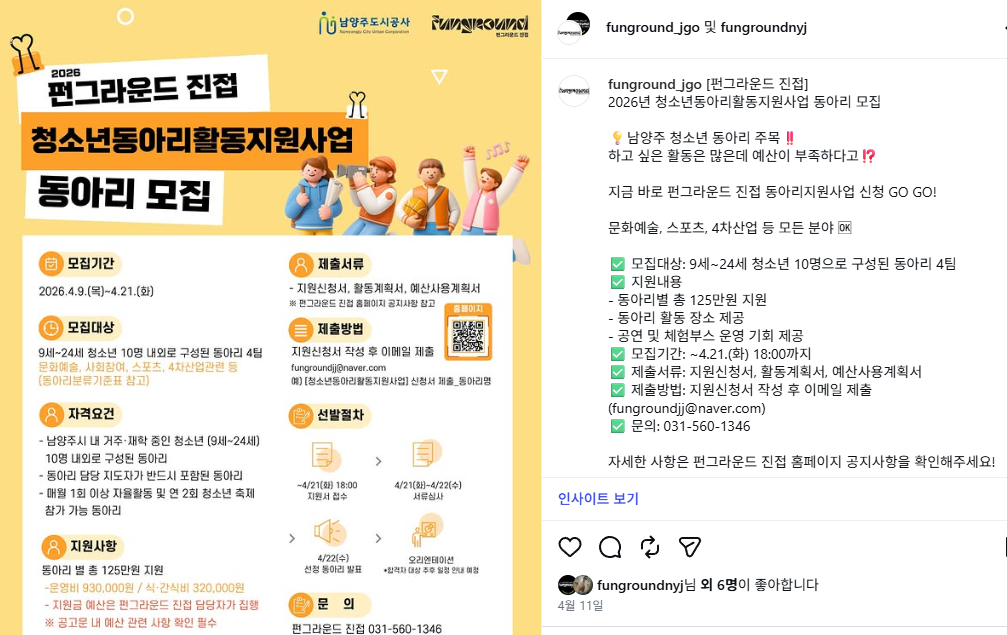 진접 청소년동아리활동지원사업 지원 동아리 모집 작성자 펀그라운드진접 등록일자 2026년 4월 23일 19시 7분 9초 조회 2 KakaoTalk_20260423_185204414.png [ Size : 421.63KB, Down : 1 ] 미리보기 다운로드 목록보기