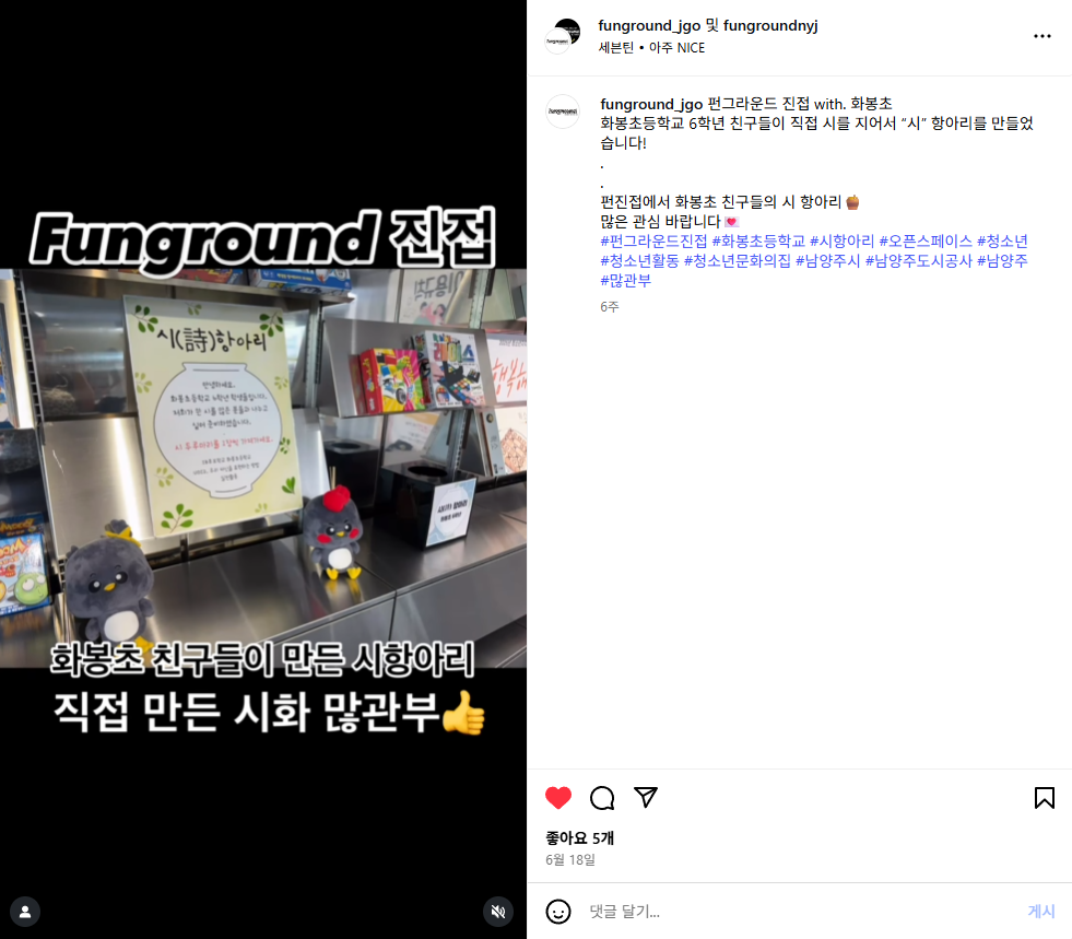 진접 [진접] 화봉초 시 항아리 작성자 펀그라운드오남 등록일자 2025년 8월 1일 15시 44분 30초 조회 95 활동 내용https://www.instagram.com/reel/DLBy50oRwo9/ 스크린샷 2025-08-01 154445.png [ Size : 409.45KB, Down : 36 ] 미리보기 다운로드 목록보기