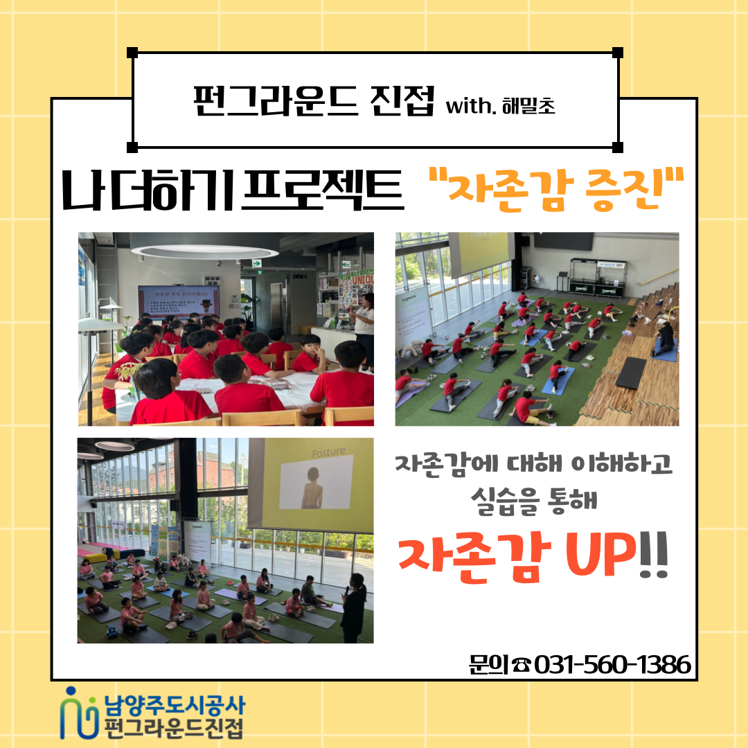 진접 [펀그라운드 진접] 나 더하기 프로젝트 "자존감 증진" (해밀초) 작성자 펀그라운드진접 등록일자 2024년 5월 23일 14시 47분 26초 조회 250 오늘은 해밀초등학교 친구들과 "자존감"에 대해 배워보는 시간을 가졌습니다!오늘의 주제를 찾는 QR코드 미션을 시작으로 건강 쑥쑥 찾아주는 필라테스, 그리고 부캐릭터 잔디인형DIY까지!!펀그라운드 진접의 학교연계는 계속됩니다! 많은 관심과 참여 부탁드립니다!! 제목을-입력해주세요_-001 (23).png [ Size : 713.79KB, Down : 102 ] 미리보기 다운로드 목록보기