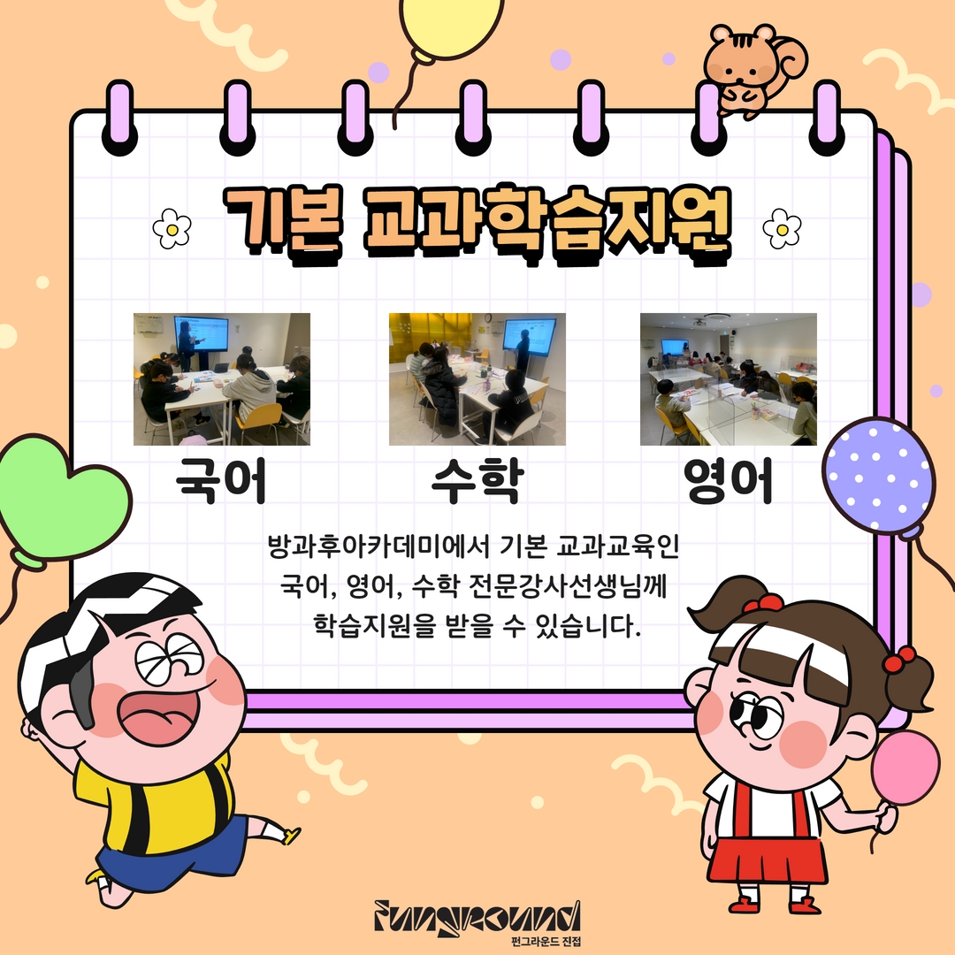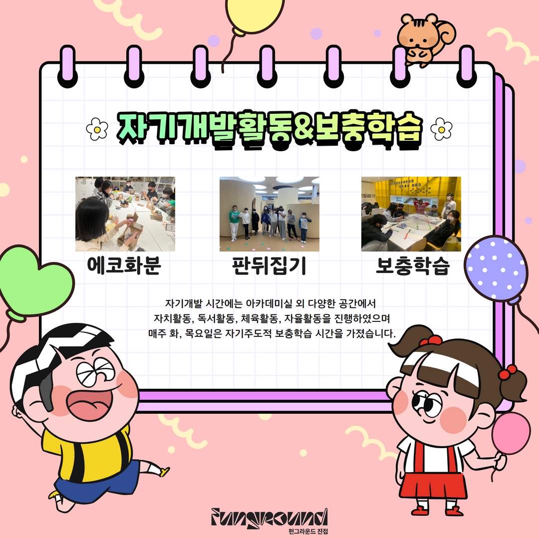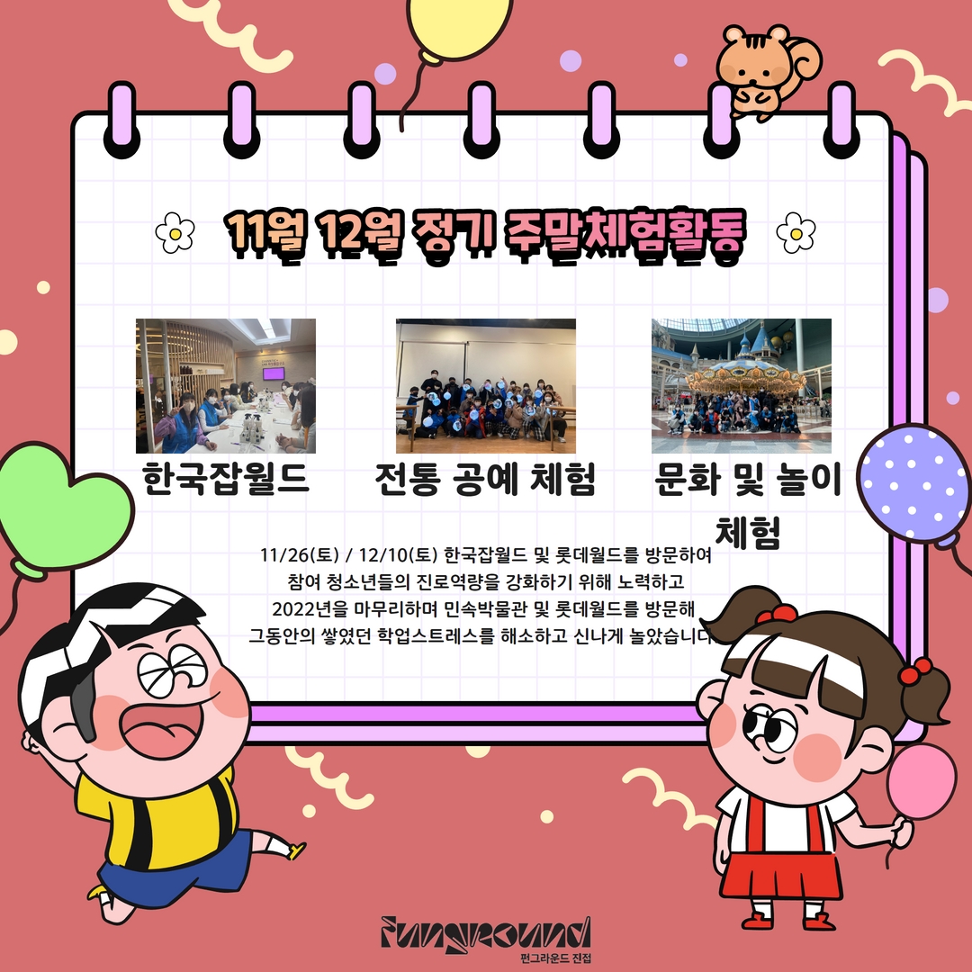 11~12월 간 기본 교과학습지원 / 주중 전문체험활동 / 자기개발&보충학습 / 주말체험활동, 특별활동 등 다양한 프로그램을 진행했습니다.