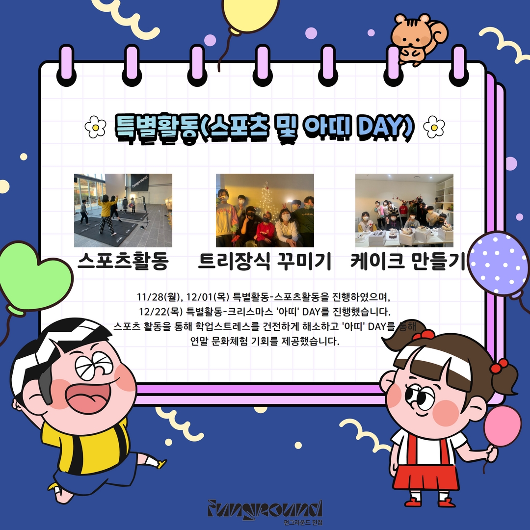 11월 28일과 12월 01일 펀그라운드에서 특별활동(스포츠활동)을 진행하여 쌓였던 학업 스트레스를 해소하고 긍정적인 에너지를 발산하는 시간을 가졌습니다.