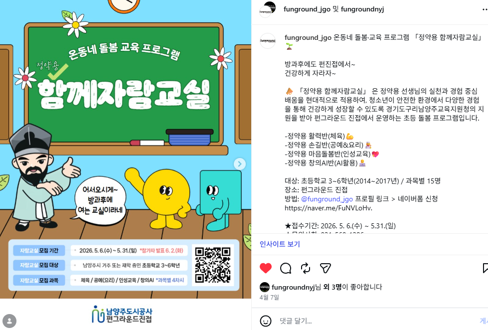 진접 온동네 돌봄 교육 프로그램 함께 자람 교실 작성자 펀그라운드진접 등록일자 2026년 4월 23일 19시 5분 44초 조회 1 KakaoTalk_20260423_185130345.png [ Size : 385.21KB, Down : 1 ] 미리보기 다운로드 목록보기