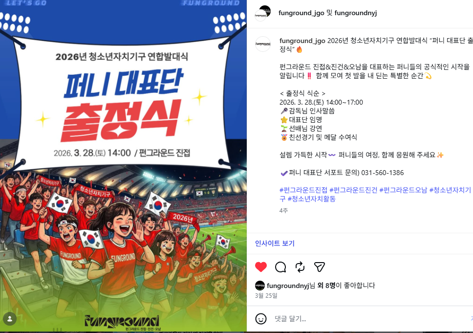 진접 펀그라운드 진접ㆍ진건ㆍ오남 연합 발대식 작성자 펀그라운드진접 등록일자 2026년 4월 23일 18시 59분 8초 조회 3 KakaoTalk_20260423_184713492.png [ Size : 701.79KB, Down : 2 ] 미리보기 다운로드 목록보기