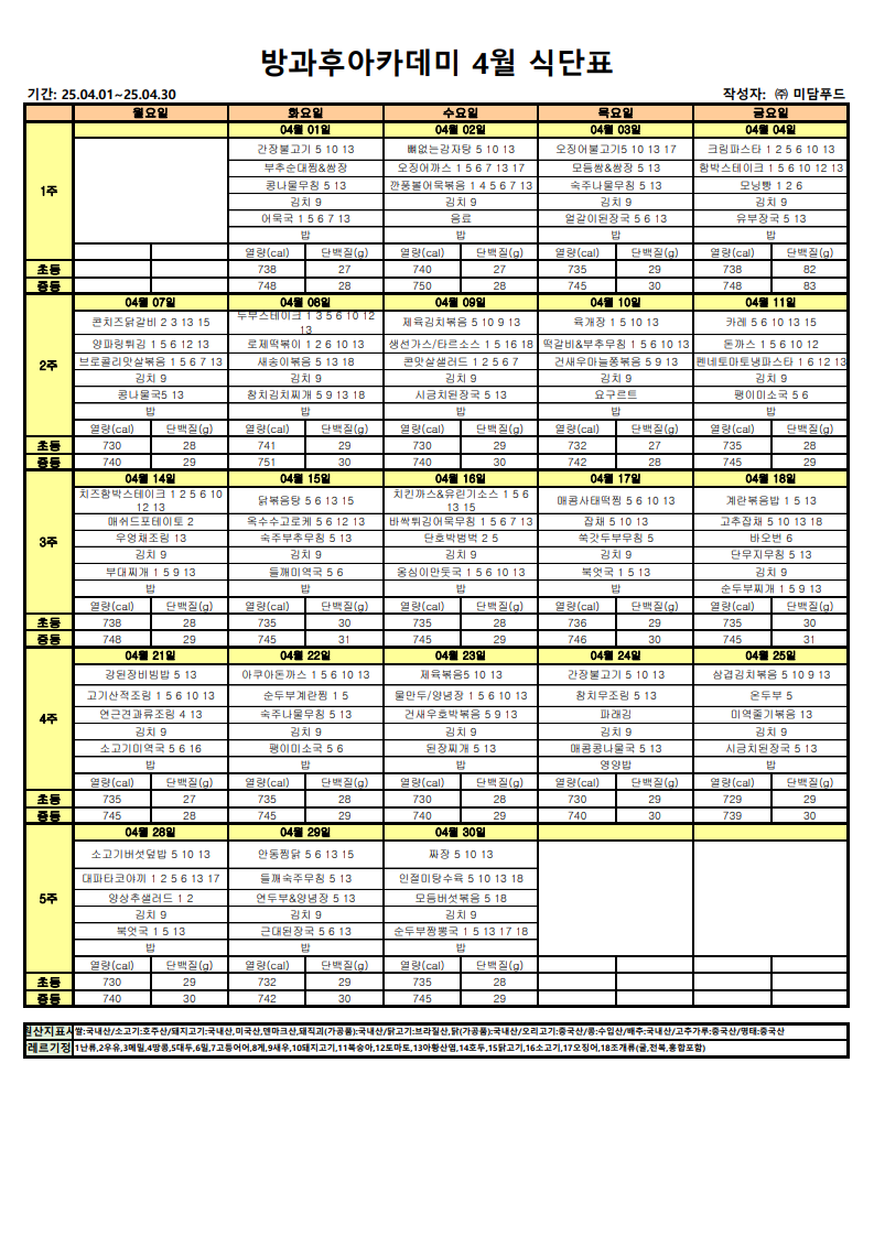 [공지사항] 2025년 4월 청소년방과후아카데미 저녁 식단표 작성자 펀그라운드진접 등록일자 2025년 3월 27일 10시 51분 30초 조회 135 청소년방과후아카데미는 매일(월~금) 저녁 식사가 제공됩니다!등록 희망 또는 문의사항이 있으시면 언제든지 연락주세요:)문의전화: 031-560-1343 4월 식단표_1.png [ Size : 188.99KB, Down : 63 ] 미리보기 다운로드 목록보기