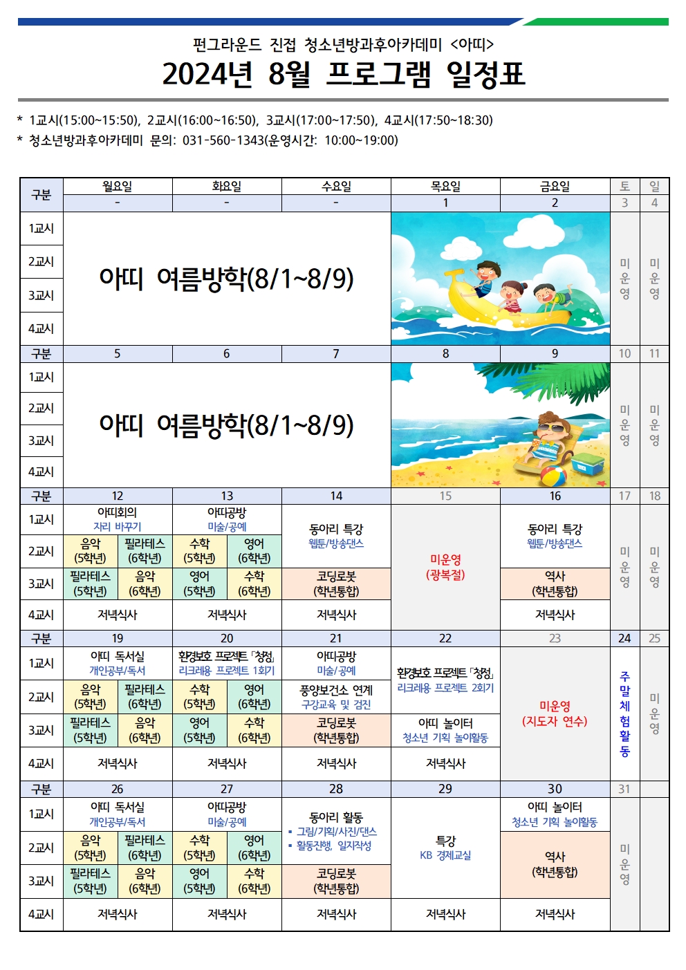 * 1~9일: 미운영(방과후아카데미 여름방학)
