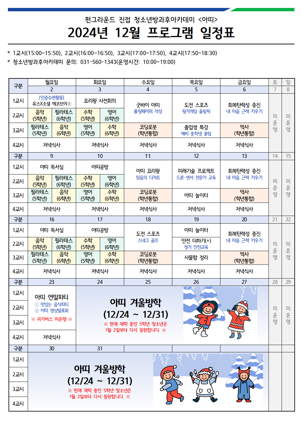 * 24~31일: 아띠 겨울방학(25년 1월 2일부터 다시 운영 시작합니다.)