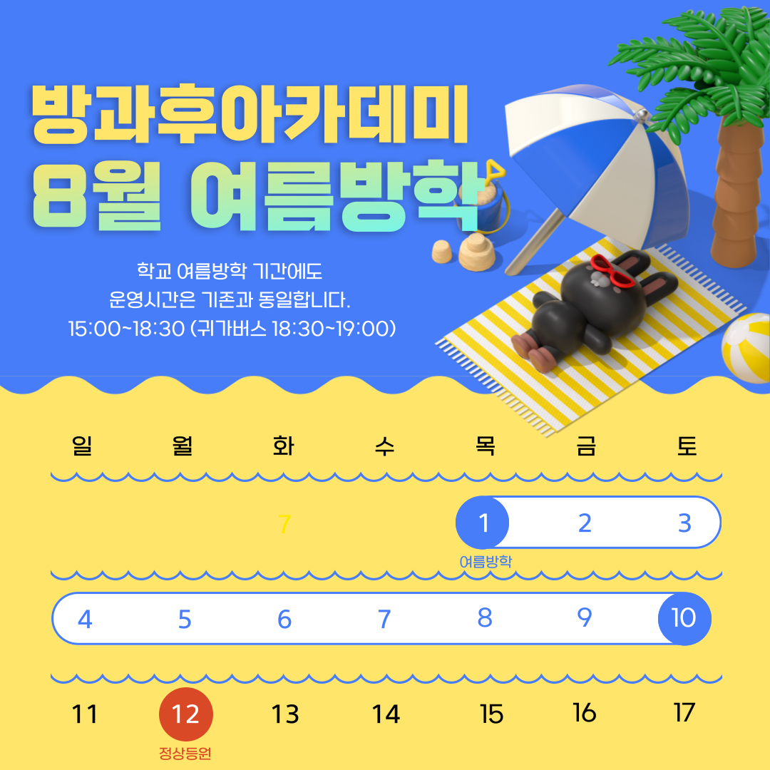 [공지사항] 2024년 8월 여름방학 안내 작성자 펀그라운드진접 등록일자 2024년 6월 28일 15시 20분 51초 조회 206 ※ 여름방학 기간: 8/1~8/9 ※주말(8/10~8/11) 지나고 8월 12일 월요일부터 정상등원합니다.학교 여름방학 기간에도 운영시간 변동없이 15:00~18:30 진행합니다.무더위 조심하시고, 행복한 하루 보내세요! 0628 여름방학.png [ Size : 421.24KB, Down : 78 ] 미리보기 다운로드 목록보기
