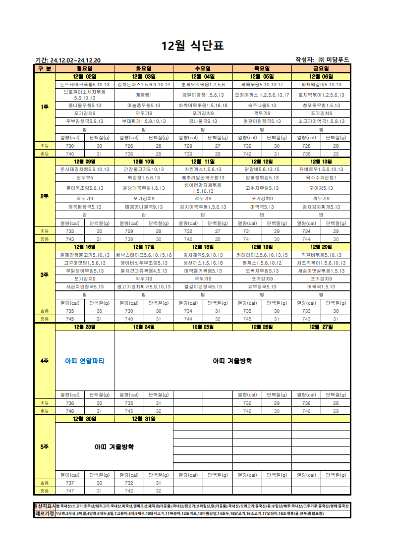 [공지사항] 2024년 12월 청소년방과후아카데미 저녁 식단표 작성자 펀그라운드진접 등록일자 2024년 11월 29일 16시 54분 23초 조회 179 청소년방과후아카데미는 매일(월~금) 저녁 식사가 제공됩니다!등록 희망 또는 문의사항이 있으시면 언제든지 연락주세요:)문의전화: 031-560-1343 page1_1.png [ Size : 142.81KB, Down : 87 ] 미리보기 다운로드 목록보기