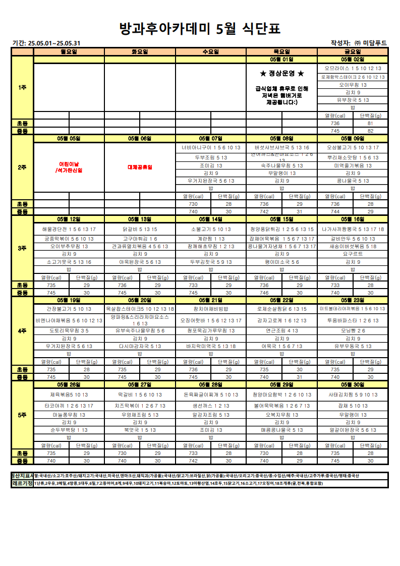 [공지사항] 2025년 5월 청소년방과후아카데미 저녁 식단표 작성자 펀그라운드진접 등록일자 2025년 4월 25일 10시 22분 46초 조회 148 청소년방과후아카데미는 매일(월~금) 저녁 식사가 제공됩니다!등록 희망 또는 문의사항이 있으시면 언제든지 연락주세요:)문의전화: 031-560-1343 5월 식단표_1.png [ Size : 181.75KB, Down : 63 ] 미리보기 다운로드 목록보기