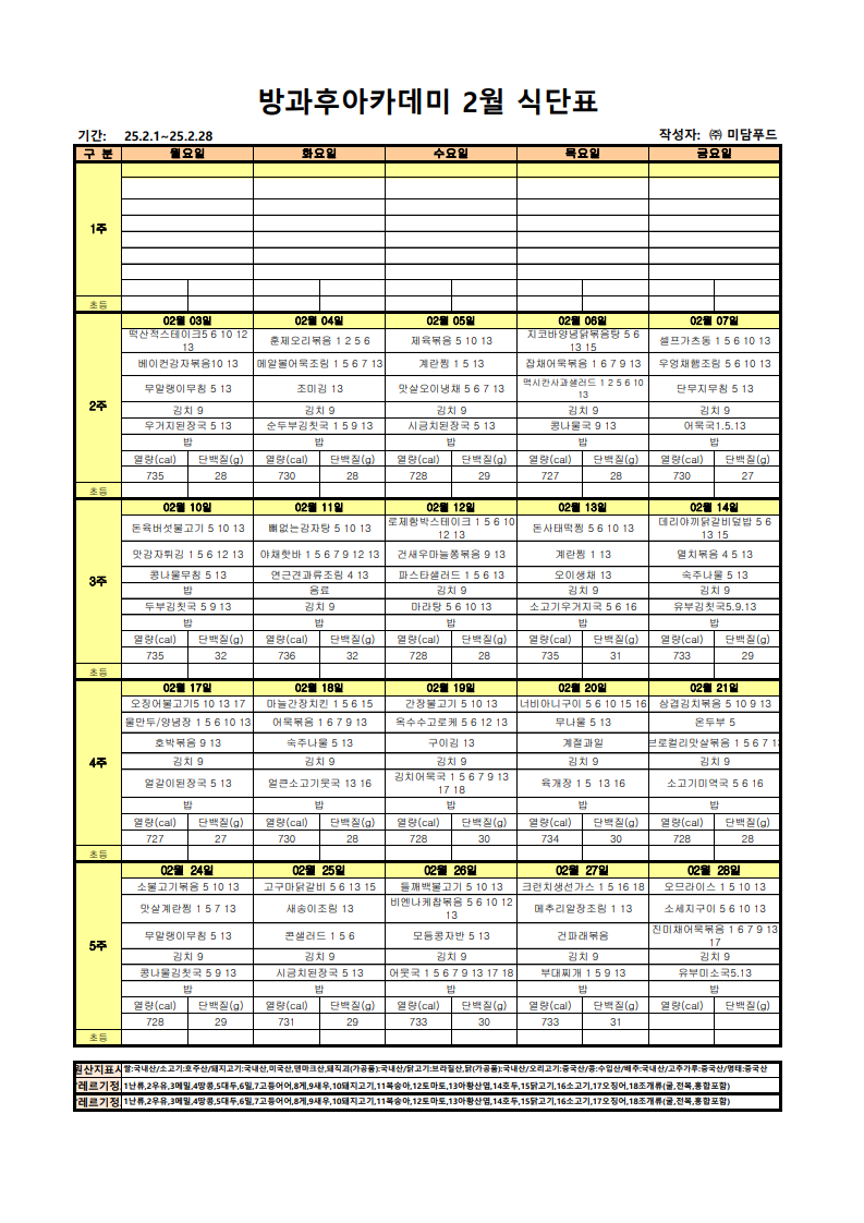 [공지사항] 2025년 2월 청소년방과후아카데미 저녁 식단표 작성자 펀그라운드진접 등록일자 2025년 1월 31일 18시 54분 6초 조회 146 청소년방과후아카데미는 매일(월~금) 저녁 식사가 제공됩니다!등록 희망 또는 문의사항이 있으시면 언제든지 연락주세요:)문의전화: 031-560-1343 2월 식단표_1.png [ Size : 162.15KB, Down : 85 ] 미리보기 다운로드 목록보기
