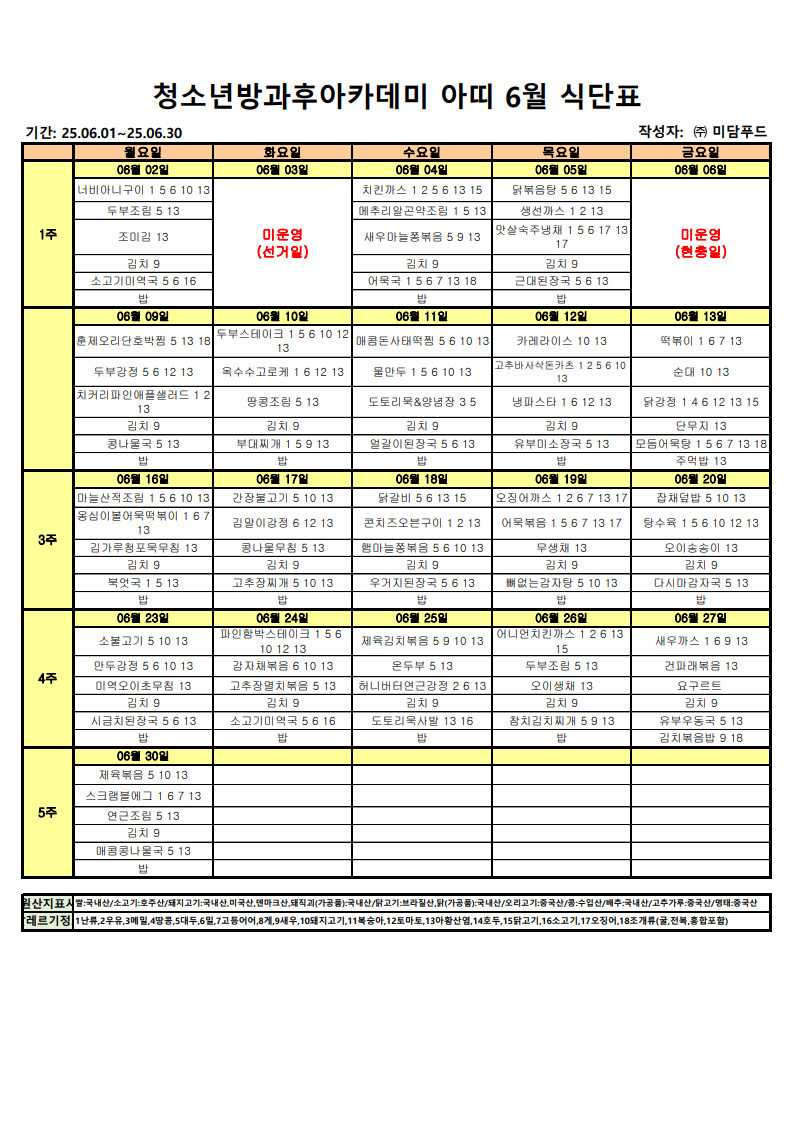 [공지사항] 2025년 6월 청소년방과후아카데미 저녁 식단표 작성자 펀그라운드진접 등록일자 2025년 5월 27일 15시 39분 8초 조회 114 청소년방과후아카데미는 매일(월~금) 저녁 식사가 제공됩니다!등록 희망 또는 문의사항이 있으시면 언제든지 연락주세요:)문의전화: 031-560-1343 6월 식단표_1.png [ Size : 173.92KB, Down : 49 ] 미리보기 다운로드 목록보기