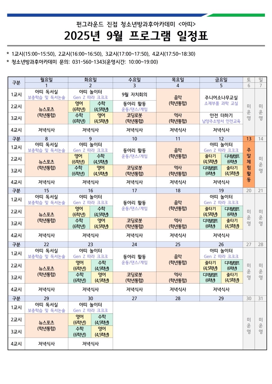[공지사항] 2025년 9월 청소년방과후아카데미 프로그램 일정