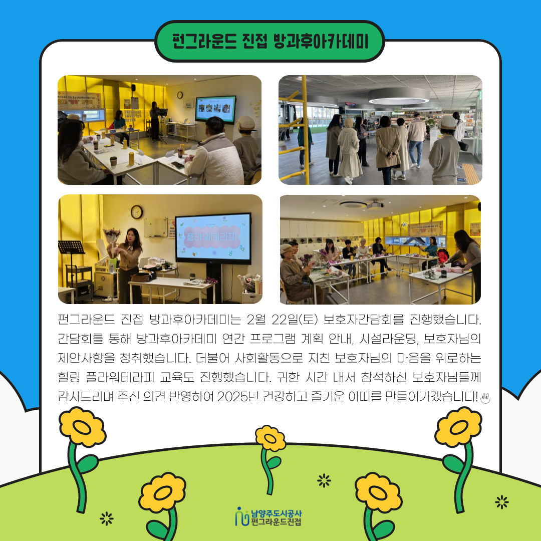 [펀그라운드 진접] 청소년방과후아카데미 "아띠" 보호자 힐링 간담회 실시 작성자 펀그라운드진접 등록일자 2025년 2월 22일 17시 24분 44초 조회 110 카드뉴스 (1).png [ Size : 226.25KB, Down : 48 ] 미리보기 다운로드 카드뉴스 (2).png [ Size : 740.59KB, Down : 55 ] 미리보기 다운로드 목록보기