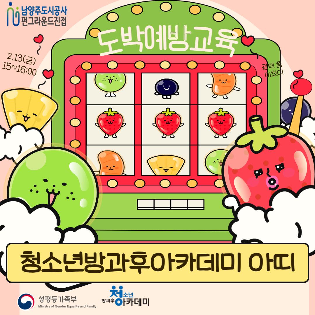 [펀그라운드 진접] 2026년 청소년방과후아카데미 2월 도박예방교육 작성자 펀그라운드진접 등록일자 2026년 2월 13일 17시 18분 45초 조회 26 2.13(금) 15:00~16:00펀그라운드 진접 청소년방과후아카데미 아띠에서는 청소년들의 건전한 성장과 올바른 가치관 형성을 위해 도박예방교육을 진행했습니다.이번 교육은 청소년들이 쉽게 접할 수 있는 온라인 게임과 사행성 활동 속 위험성을 이해하고, 스스로 올바른 선택을 할 수 있도록 돕는 시간을 마련했습니다.청소년들이 스스로 삶의 주인으로서 건강한 미래를 만들어갈 수 있도록, 앞으로도 다양한 예방교육과 체험 프로그램을 이어갈 예정입니다. 제목을 입력하세요 1.jpg [ Size : 742.41KB, Down : 10 ] 미리보기 다운로드 제목을 입력하세요 2.jpg [ Size : 1.03MB, Down : 8 ] 미리보기 다운로드 목록보기