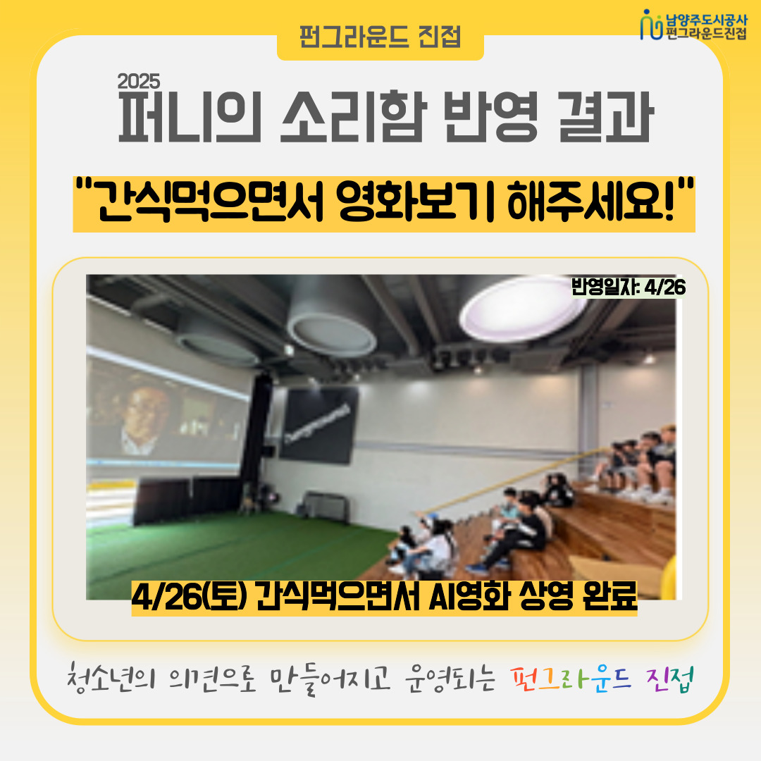 펀그라운드 진접을 이용하는 청소년들이 다양한 의견을 제시하고 공유할 수 있는 게시판입니다 (반영일: 2025.4.26.) 4/26(토) 간식먹으면서 AI영화 상영 완료 작성자 펀그라운드진접 등록일자 2025년 7월 5일 18시 32분 30초 조회 85 025.jpg [ Size : 245.9KB, Down : 37 ] 미리보기 다운로드 답변하기 목록보기