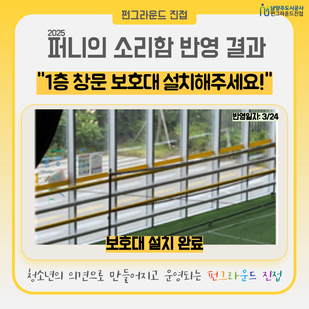 펀그라운드 진접을 이용하는 청소년들이 다양한 의견을 제시하고 공유할 수 있는 게시판입니다 (반영일: 2025.3.24.) 보호대 설치 완료 작성자 펀그라운드진접 등록일자 2025년 7월 5일 18시 35분 49초 조회 91 031.jpg [ Size : 253.74KB, Down : 35 ] 미리보기 다운로드 답변하기 목록보기